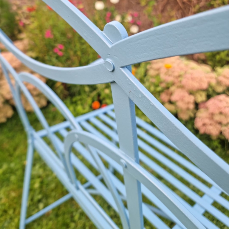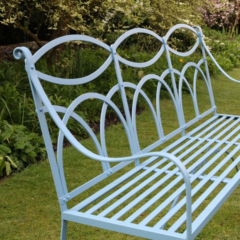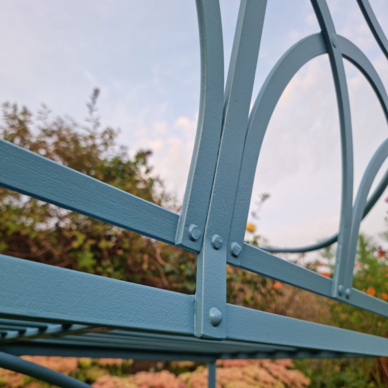 Each one is made by our team of skilled blacksmiths here in the Ironart workshops in Bath using a flat steel profile. We use time-honoured joining techniques to construct the elegant backs of these benches, and incorporate a rivetted leg brace detail.