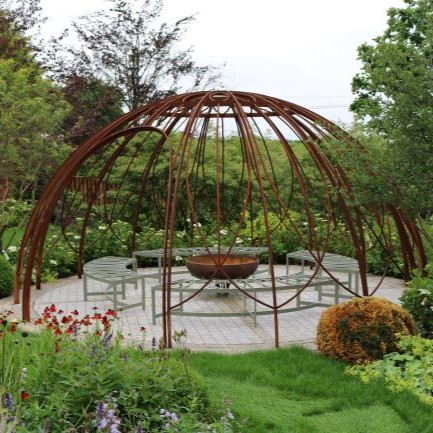 This igloo style gazebo was designed, created and installed by the team at Ironart for a client with a stunning garden. The brief was to create a sheltered, intimate cocooned space in their garden within an established planting scheme.